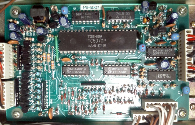 재미있는 부분은 VFO인데, 발진 회로는 TS-530과 같지만 바리콘이 아니라 Collins형 원형 PTO가 들어 있습니다. 크기와 형태는 맨 위 사진에 나온 R-392용 70E-18과 같은데, 자세한 사양은 모르겠습니다. 그러나 Collins의 디자인임은 분명합니다. 여기에 감속 기어를 통해 메인 튜닝 샤프트에 연결이 됩니다. 그리하여 1회전에 약 25KHz 정도가 변화하고 5.5 - 6 MHz의 출력이 나옵니다. 이 신호와 PLL 출력이 카운터에 들어가 주파수가 100Hz 단위까지 표시가 됩니다. 카운터는 따로 레퍼런스가 없고 PLL의 10MHz 레퍼런스의 정확도가 직접적으로 주파수 표시의 정확도를 결정합니다. 카운터부도 몇몇 부품의 변화를 제외하고는 TS-530과 동일합니다. 주파수 표시 VFD는 530과 같은 납작한 것이 아니라 튜브형입니다.
