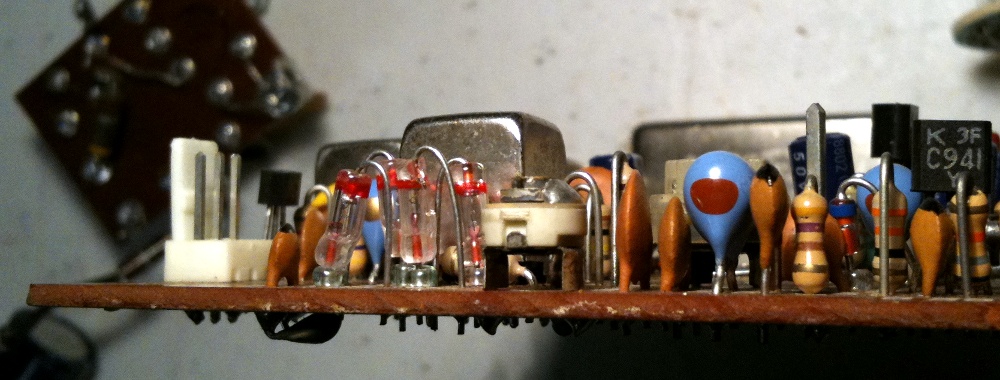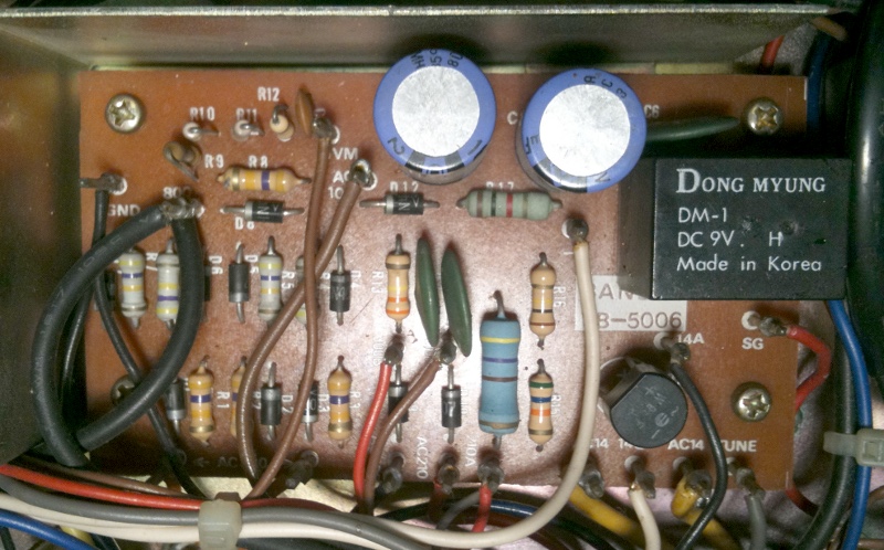 조정을 시도하다가 발견한 것은 12V 정전압 회로에 문제가 있는 것이었습니다. 그 출력에 기반하여 9V와 3.2V를 뽑아내게 되고, 이 중 9V의 안정도는 바로 VFO의 안정도에 직결이 되므로 12V 정전압은 매우 중요한 것입니다. 전원 트랜스가 110V 탭에 연결이 되어 있는데, 이곳의 라인 전압은 125V로 되어 있고 실제로 측정하면 128V가 나오는 아주 좋은 동네입니다. 올드라디오가 고생하는 곳이죠. 그래서 12V 정전압의 입력도 약 2-3V는 높았고, 따라서 전압 강하를 담당한 TR이 약 10V를 덜어내야 하는 부담이 있었고, 규격표에 의하면 섭씨 25도에서 전위차 10V에 부하가 1A 넘으면 돌아가신다고 되어 있었습니다. 실험을 하고 측정을 하던 중 결국 정말로 돌아가셨습니다. 그래서 간단히 정전압 회로를 LM7812 기반으로 교체하였습니다. LM7812도 열받으실까봐 앞에 4옴 저항을 달아서 방열판에 붙여 두어서 LM7812의 입력에는 약 15-16V가 인가됩니다. 여차하면 LM7812 두 개를 병렬로 하고 각 출력에 실리콘 다이오드를 붙여 역전류를 막으면 안전하게 전류 용량을 늘일 수 있다고 들었습니다만, 그럴 필요는 없어 보입니다.